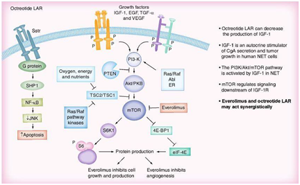 mTOR is a central regulator of protein synthesis important in cancer, including cell growth and proliferation, angiogenesis and cell metabolism. Several genetic syndromes associated with NETs involve signaling through the mTOR pathway (Figure 10). Everolimus, (Afinitor®, Novartis), is a new oral, once-daily mTOR inhibitor that blocks the mTOR pathway by binding to its intracellular receptor, FKBP-12. In preclinical studies, everolimus inhibited tumor growth in a variety of human solid tumors, both in vitro and in vivo. Everolimus has synergistic anti-tumor effects when used in combination with other anticancer agents and may have a similar effect when used in combination with a somatostatin analogue. A study of 60 patients with metastatic low- to intermediate-grade NETs (30 with primitive NETs and 30 with nonprimitive NETs) assessed the antiproliferative effect of combining everolimus with octreotide. Promising anti-tumor activity and PFS was observed in those who received a higher dose of everolimus (10 vs 5 mg/day) had slightly better partial response and PFS rates. A Phase II trial of everolimus with or without octreotide LAR in patients with advanced pancreatic NETs following chemotherapy failure (RADIANT-1) found that in those receiving everolimus monotherapy, median PFS was 9.7 months, and 89 patients (77.4%) experienced a stabilization or decrease in tumor size. By contrast, patients receiving everolimus 10 mg/day plus octreotide 30 mg/month achieved a median PFS of 16.7 months, and 38 patients (84.4%) had tumor stabilization or shrinkage. In the RADIANT-3 study, a Phase III trial in advanced pancreatic neuroendocrine tumors, 410 patients were randomized either to everolimus 10 mg/day plus best supportive care or placebo plus best supported care. The majority of the patients presented well differentiated or moderately differentiated tumors. Half of the patients in each arm had previously been treated with chemotherapy and 50% of the patients in each arm also received somatostatin analogs. Median PFS in the treatment arm was 11.4 vs 4.6 months in the placebo arm (HR: 0.35; p < 0.0001). The most common side effects in all the RADIANT trials are stomatitis followed by infections and pneumonitis. However, grade 3/4 adverse events only occurred in approximately 5% of patients and therefore everolimus should be considered a safe and well tolerated treatment in patients with neuroendocrine tumors (abstract presented at ESMO 2010). An additional advantage of everolimus in the treatment of patients with metastatic insulinomas is its capability to increase blood glucose levels.78–84