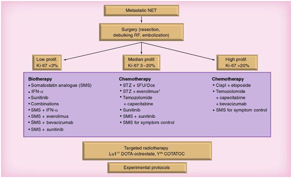 Although the response rate of NETs to external beam radiation is limited, the introduction of systemic receptor-targeted therapy (peptide receptor radiotherapy (PRRT)) has provided beneficial effects in patients with unresectable somatostatin receptor-positive NETs. Current data suggest objective response rates of 30-40% with disease stabilization in 40% of patients. One study assessing PRRT with the radiolabeled somatostatin analog 9177Lu-DOTA0, Tyr30 octreotate in 310 patients with NETs observed complete and partial tumor remissions in 2 and 28%, respectively.] Minor tumor response (decrease in size >25 to <50%) occurred in 16% of patients. Compared with historical controls, there was a survival benefit of 40-72 months from diagnosis.107–109 A suggested algorithm for the treatment of patients with metastatic NETs, based on the author's experience, is included in Figure 11.