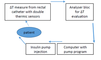 The hypothesis was that continuous record of ∆T, (differential temperature ∆T=core temperature Tc–superficial temperature Ts) represents the result of energy production and utilization, thus reflects glucose metabolism, and hence can be a valuable complement to blood glucose measure for monitoring insulin therapy . Devices were created and tested which used ∆T evolution as a feedback for automated insulin delivery.