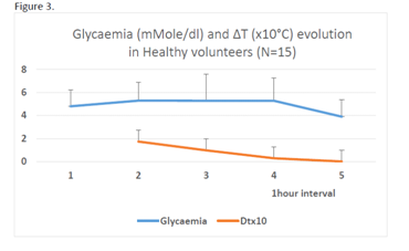 Statistic evaluation was provided using Average or Mean +/- Standard Deviation (M+/-SD) calculation and Tc against Tst Student criterion determination of liability (p). Involvement of other not parametric statistic was considered but did not change the results. Correlation between ∆T and glycaemia was not calculated considering the probable discordance in time of the two parameters.7–9,16