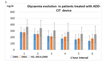 Conclusion: The ADD-CIT patients have shown faster glycaemia decrease and stabilization, less hypoglycaemia events than UT patients independently on hyperglycaemia causes. This supports the hypothesis that ∆T evolution registration is useful as a complementary feedback for insulin delivery management in any patients with acute severe hyperglycaemia.
