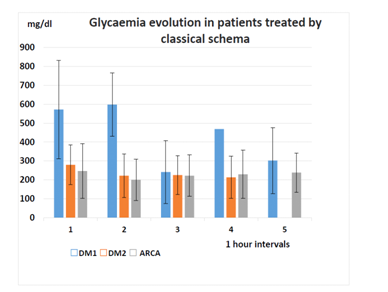 Interesting that the effect of both treatment techniques were slightly different depending on the kind of pathology concerned. ADD-CIT seemed to be more efficient in DM 1 than in DM 2 patients. On the contrary classical treatment has led to a certain stabilisation in DM 2 patient mean glycaemia though the last remained about 200 mg/dl. Heart disease DM0 patients were the more difficult to be helped. That means that ADD-CIT as any other insulin treatment of hyperglycaemia has its limits: as long as the causes of the disorder are not eliminated a relapse has to be awaited. It explains the situation with ARCA patients. So ADD-CIT is only an adapted correction of acute hyperglycaemia, because ∆T evolution is more sensible to metabolism variations than glycaemia: the reactions were noted within 1-2 min. instead of 30-40 min or even more. This is one of the probable explanations of the absence of correlation between glycaemia and ∆T.