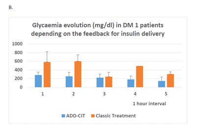 Results: In the ADD-CIT subgroups a 30-40% glycaemia decrease from its initial value was observed within 2-4 hours versus 5-7 hours in the UT subgroups. Episodes of hypoglycaemia (<4.3 mMole/l) were registered in 15% of the ADD-CIT sessions (10 patients, all DM1), versus 22.5% in the UT subgroups. Yo-yo phenomena were exceptional in ADD-CIT subgroups and frequent in UT. ∆T reactions occurred about 1 hour before glycaemia ones that might explain the better adaptation of insulin delivery to the patient’s needs in ADD-CIT subgroups than in UT ones. ∆T levels approaching values observed in healthy persons signed stopping the session. Sometimes ∆T decreased at the session end, glycaemia remaining stable: then a cautious glucose injection corrected the situation without glycaemia modification.