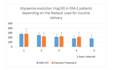 Though our series were small and not fully matched, the mean results of insulin therapy in ADD-CIT groups of patients in terms of glycaemia decrease and stabilization as well as decrease of hypoglycaemia event frequency and repeats looked convincingly better than in patients treated by the usual procedure only based on glycaemia measurements. This confirms the usefulness of ∆T evolution evaluation as a complementary feedback for insulin delivery not only in DM 1 patients but also in DM 2 and any other patients with acute severe glucose metabolism disorders.