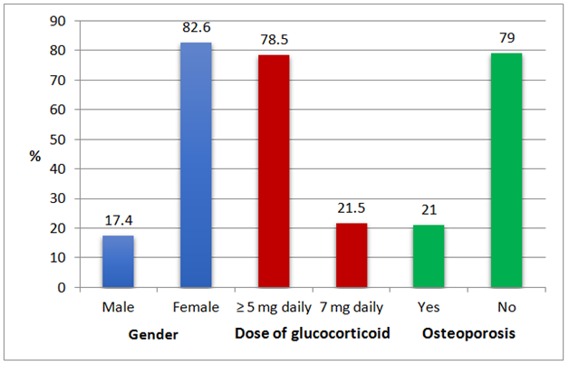 The files of 362 patients were included. Figure 1 illustrates that the study sample consisted mostly of women (82.6%); the most frequently prescribed prednisolone dose ≥5mg daily (78.5%); and those diagnosed with osteoporosis constituted 21%.
