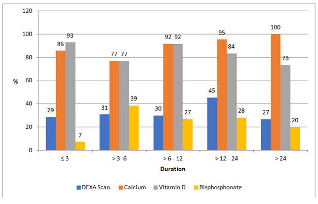 Results: Files of 362 patients were included. Most patients were women (82.6%) and had prednisolone dose ≥5mg daily for more than 6months (78.5%). Those diagnosed with osteoporosis constituted 21%. Dual energy x-ray absorptiometry (DEXA) scan was done in 40.9% of patients, irrespective of the dose or duration of use of prednisolone. The majority of patients were given calcium and vitamin D (93.9% and 84.5%, respectively); while only 27.1% had bisphosphonate. Increase in age was associated with a decreased risk (patients were more likely to have DEXA scan); while patients with increased body mass index (BMI) were more likely not to have DEXA scan, compared to the underweight.
