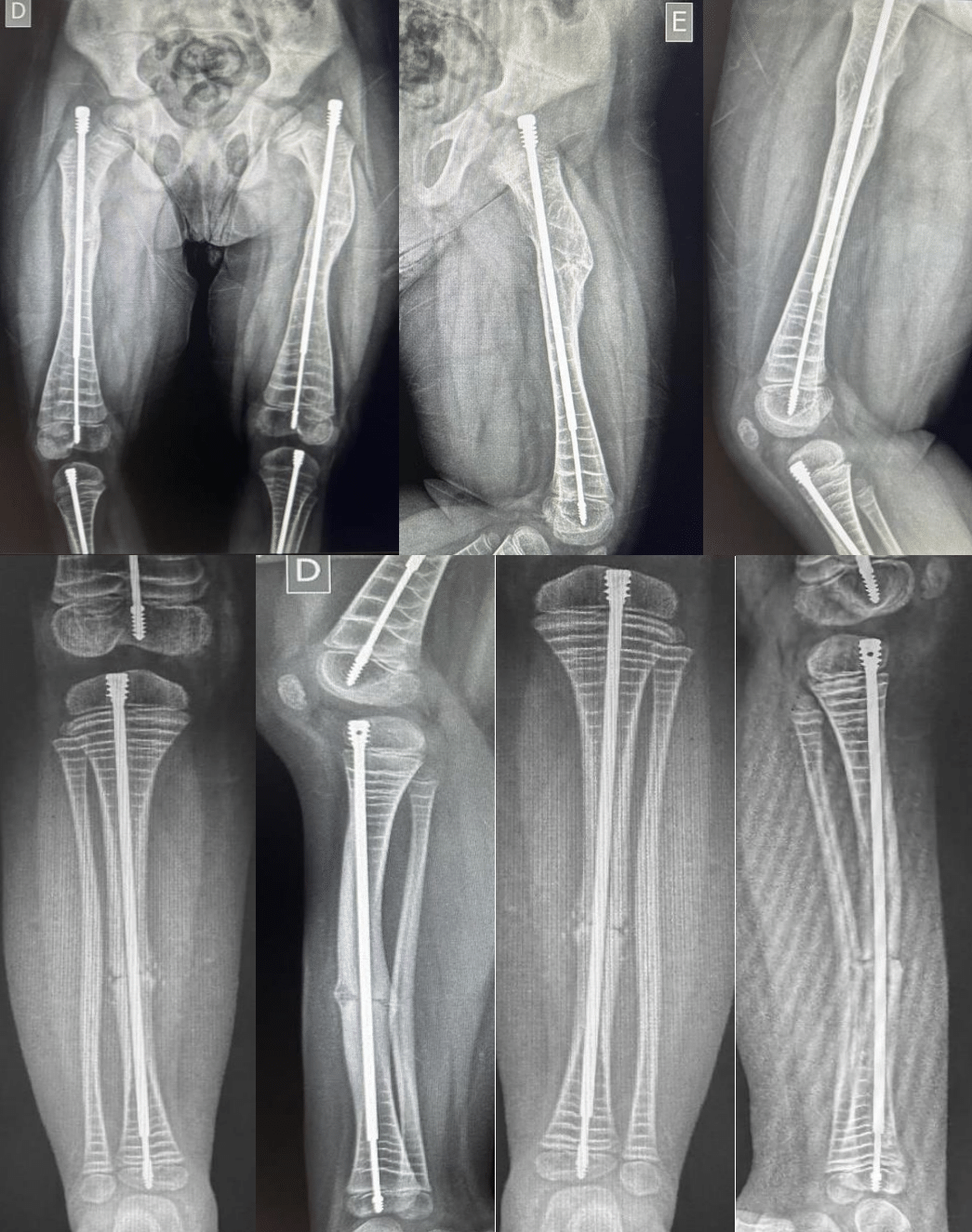 He was operated for correction of right and left femur on a same surgical time in March 2022. Posteriorly he was underwent right tibia treatment in august 2022 and left tibia in May 2023. (Figures 2)
