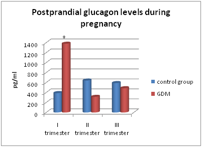 Results: Basal glucagon level in the group of women with GDM was 1503.8±528.4, in the control group – 820.3±140.1 pg/ml (p<0.05). Postprandial glucagon level in the group of patients with GDM was 527.5±76.6, in the control group – 323.3±118.6 pg/ml (p<0.05). The most considerable differences between basal and postprandial glucagon levels in comparable groups were administrated in those women who developed GDM in the first trimester of pregnancy. GLP1 level in the group of women with GDM was 2.20±1.01, whereas in the healthy group it was 0.62±0.16 ng/ml (p<0.05). An average GLP-1 level in all the