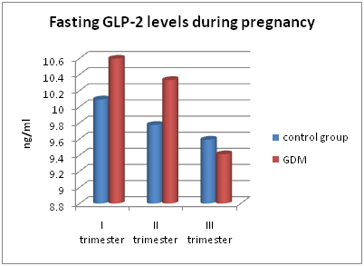 trimesters was significantly higher in women with GDM compared to the control group of patients with NGT (Table 1). The most considerable differences between GLP-1 levels in comparable groups were administrated in those patients who were diagnosed with GDM in the first and third trimesters of pregnancy. GLP2 level in the group of patients with GDM was 11.74±1.45, in the control group –10.53±0.3 ng/ml (p>0.05). The concentration of this hormone tended to be grater in those women who were included in the study in the first and second trimesters compared to those in the third trimester of pregnancy.