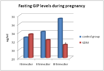 The fasting secretion of GIP hormone in the group of patients with NGT was higher among women examined in the third trimester of pregnancy compared to those in the second and first trimesters. The situation was different in the main group. In GDM patients the secretion of GIP was maximal among women in the first trimester of pregnancy and minimal among women in the third trimester. The difference in fasting GIP secretion between the main and the control groups was significant for women included in the study in the third trimester of pregnancy (Figure 9).