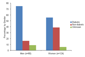 Results: The study population included 204 tertiary care patients, 129 of whom had a diagnosis of diabetes (128 with Type 2 Diabetes and 1 patient with Type 1 Diabetes), indicating an overall prevalence 63.2%. Twelve subjects (5.9%) met the definition for being prediabetic and 14 subjects (6.9%) had no screening for diabetes. The association between diabetes status and gender was statistically significant with 69 out of 204 (33.8%) patients being diabetic women and 60 out of 204 (29.4%) being diabetic males compared to non-diabetic patients and patients with unknown status (p-value=0.003). Among males, 75% had diagnosed diabetes compared to 55.7% of females with diagnosed diabetes in this cohort. Mean age in subjects with diabetes was 60.4±10.9 years (range: 32-89) and mean BMI was 32.8±6.2 kg/m2 (range:18.7-51.9). The mean age was significantly different for patients with diagnosed diabetes (µ=60.4) compared to those without diabetes (µ=53.6) and those with unknown status (µ=46.0) (p-value˂0.0001).