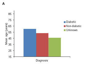 The association between diabetes status and gender was statistically significant with 69 out of 204 (33.8%) patients being diabetic women and 60 out of 204 (29.4%) patients being diabetic men compared to 48/204 (23.5%) non-diabetic and 13/204 (6.4%) non-diabetic men and 7/204 women (3.4%) and 7/204 men (3.4%) with unknown diabetes status (p=0.003) (Table 2). Overall, the prevalence of diagnosed diabetes in male patients was 75.0% compared to males who were non-diabetic (16.3%) or had an unknown status (8.8%) while the prevalence of diagnosed diabetes in female patients was 55.7% compared to women who were non-diabetic (38.7%) or had an unknown status (5.7%) (Figure 1). The mean age of all subjects was 57.4±13.1 years (range: 18-89) with no significant difference in the mean ages of female patients (µ=58.4) and male patients (µ=55.8) (p=0.16). Analysis of variance revealed that the mean ages for diabetic patients (µ=60.4), for non-diabetic patients (µ=53.4), and for patients with unknown diabetic status (µ=46.0) were significantly different (p˂0.0001) (Table 2) (Figure 2A).