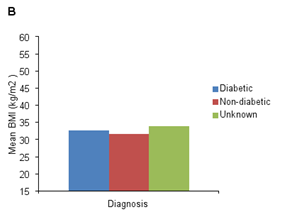 The mean BMI of all subjects in the study was 32.5±6.5 kg/m2 (range: 18.3-55) (Table 1). The mean BMI for women (µ=33.1) and the mean BMI for men (µ=31.6) were not statistically different (p=0.11). Analysis of variance showed no statistically significant difference (p=0.43) in the mean values for BMI of diabetics (µ=32.8), non-diabetics (µ=31.7) and patients with unknown diabetic status (µ=33.9) (Table 2) (Figure 2B).