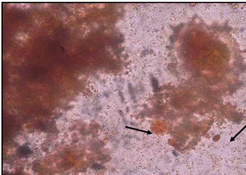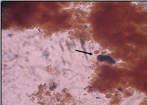 Figure 3 Lugol’s iodine stained stools smear showing Giardia lamblia cyst and Entamoeba histolytica cyst (x400).
