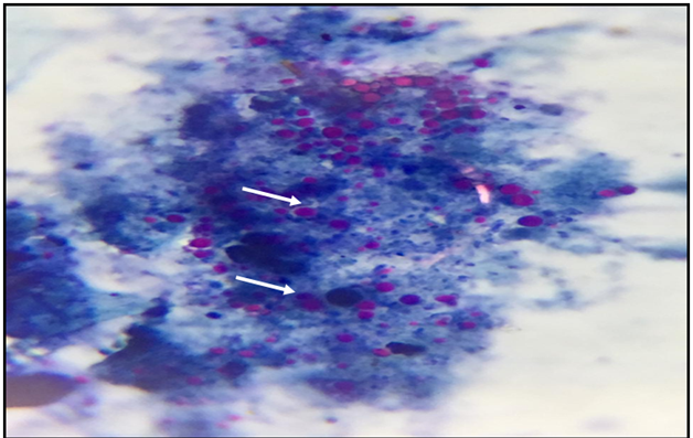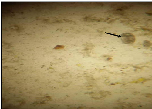 Figure 6 Stools smear stained with modified Ziehl –Neelsen stain showing Cryptosporidium spp. Oocyst (x1000).