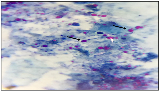 Figure 7 Stools smear stained with modified Ziehl –Neelsen stain showing Cryptosporidium spp. oocyst (x1000).