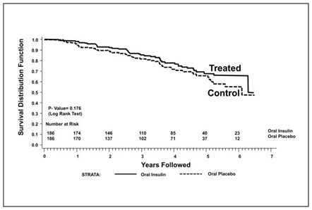 Approximately 1 in 20 first-degree relatives and 1 in 300 people without type 1 diabetes in the immediate family have multiple islet auto antibodies. Most young individuals with multiple islet autoantibody positivity progress to diabetes in 5–10 years; however, the rate of progression decreases with age. Four large secondary prevention trials have found no effect on the rate of progression to clinical type 1 diabetes for insulin administered parenterally,13 orally,14 or intranasally,15 as well as for oral nicotinamide.16 Two large randomized double-masked secondary prevention trials using oral and intranasal insulin are still underway.17,18 In the DPT-1 trial of oral insulin, the median duration of follow-up was 4.3 years; 97 subjects developed T1D – 44 in the oral insulin group and 53 in the placebo group, as summarized in figure 2.