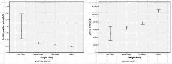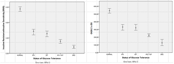 This finding was expecting in hospital population like us with high risk to development type 2 diabetes. The secretion insulin index, early insulinogenic index (EII), was similar between men and women. As we expected the highest value was associated with low weight in both genders.
