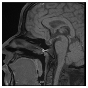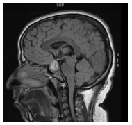 A 31years old man presented to the emergency department with five days history of severe headache accompanied by nausea, dizziness, and blurred vision. The patient’s past medical history was unremarkable and was not on any medications. He is married with 3children, the youngest is 3years old. On physical exam, he was hemodynamically stable with no orthostasis, conscious, oriented and in moderate pain distress (5/10 on pain scale chart). His central nervous system exam showed normal mini-mental status, cranial nerves examination was normal with preserved visual fields. His presentation prompted a brain MRI which showed pituitary macroadenoma with a suprasellar extension (Figure 1) with hemorrhage suggestive of pituitary apoplexy. Hormonal profiles is shown in Table 1, consistent with panhypopituitarism due to non-functional pituitary macro-adenoma with apoplexy. The decision for conservative management was opted for in keeping with the severity of the presentation. He improved and discharged 2days later on hydrocortisone and levothyroxine. However, a few days later he expressed a major concern of diminished libido and sexual dysfunction. At this point, Cabergoline 0.5mg orally twice weekly (off-label) was started with an improvement in his sexual functions within a few days, recovering his pituitary functions (off hormonal replacement). Follow-up MRIs (Figure 2) showed marked shrinkage of the macroadenoma which completely resolved in the most recent image (Figure 3) two years later.