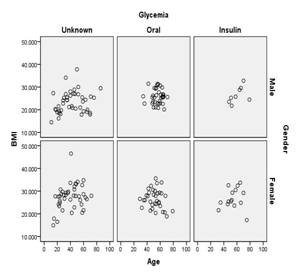 Now we bring in gender and Glycaemia into the picture. We have constructed tables for minimum, maximum, mean and standard devitation of the four vatiables like Table 2(A), corresponding to the six groups. Since no new conclusion could be drawn from these tables, we dropped these.