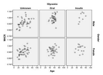 There are two categorical variables in the study – (A). Fixed1 gender – male or female,2 glycaemia –unknown, on oral medicine or on insulin. There are four (B) continuous variables3 Age (in complete years),4 RBG (Random Blood Glucose),5 BMI (Body Mass Index = {weight in kilogram/ height in meter2}),6 WHCR (Waist Hip Circumference Ratio). Duration of diabetes, Period of treatment, Life style and Type of food are likely to be major factors. But we dropped these from study, fearing patients’ response are likely to be error-prone. Out of curiosity, we also wanted to find out whether there is any association between glycaemia and family history.