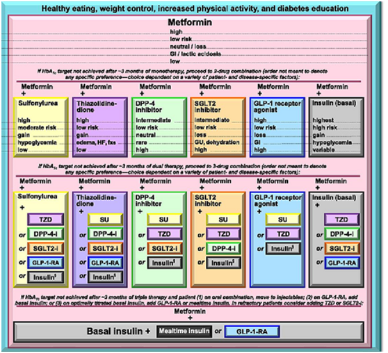 National Institute for Health and Care Excellence3 in the UK recommends metformin as initial drug treatment of choice in patients with T2DM. Similarly American Diabetes Association (ADA) and the European Association for the Study of Diabetes (EASD) (2015) (Appendix 1) published a position statement on the management of T2DM putting metformin as first line drug of choice. Florez43 describes metformin as the “undisputed queen” of all type 2 diabetes drugs which tops all the professional society algorithms as first-line drug to be given as soon as patient is diagnosed with T2DM.