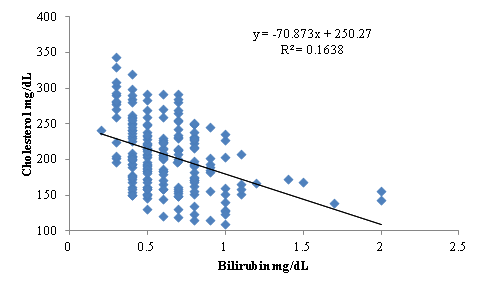 Correlation of bilirubin with cholesterol: The concentration of bilirubin (mg/dL) showed negative significant association with cholesterol (mg/dL) (r = -0.446; p < 0.01) (Figure 1).
