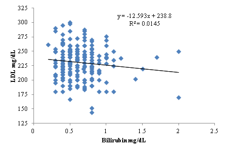 Correlation of bilirubin with LDL-cholesterol: The concentration of bilirubin (mg/dL) form negative significant association with LDL-cholesterol (mg/dL) (r = -0.349; p < 0.01) (Figure 2).