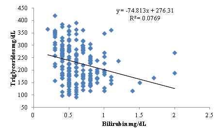 Correlation of bilirubin with Triglycerides: The level of bilirubin (mg/dL) showed negative significant association with triglycerides (mg/dL) (r = -0.365; p < 0.01) (Figure 3).