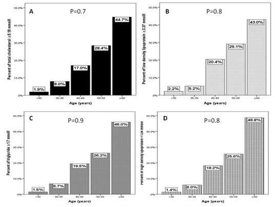 Percentage of TC, LDL, TG and low HDL CKD is consistently non-statistically increasing with age, Figure A-D.