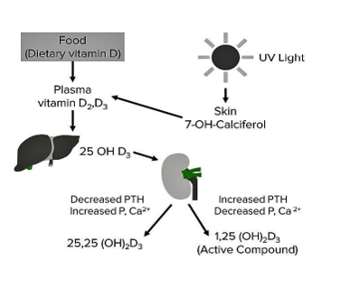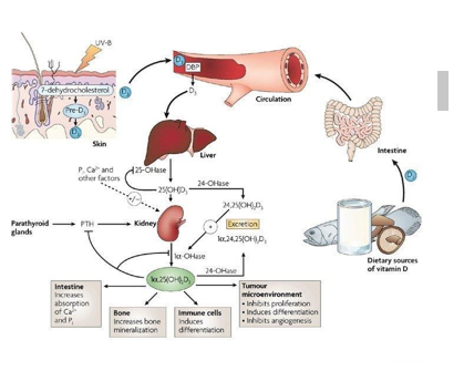 Vitamin D is a prohormone that is essential for bone and muscle health in addition to many biological functions in the human body. Some foods contain modest quantities of Vitamin (Provitamin) like dairy products, fatty fish, and mushrooms. However, the best source of Vitamin production is exposure to sunlight (ultraviolet B spectrum) for enough time during specific hours of the day and the area of skin exposed. All these factors will enable the healthy skin to synthesize the provitamins by cholesterol and ultraviolet rays. This provitamin will undergo a two-step hydroxylation in the liver (25{OH}) then the final 1-alpha hydroxylation in the kidney to produce the active vitamin (or the hormone) calcitriol. This active hormone will bind to vitamin D receptors (VDR) in many tissues and eventually exerts its biological effects. With advancing age, there will be a decline in VDR expression. Among unique biological actions is on the intestinal epithelium binding to VDRs, leading to calcium-binding protein synthesis which facilitates calcium absorption. On the other hand, the absorption of elemental oral vitamin D occurs in the duodenum and upper jejunum, therefore any pathology in this vicinity, in addition to bariatric surgery will lead to vitamin deficiency. Vitamin D production and degradation are under strict metabolic control by various feedback pathways Figure 1.
