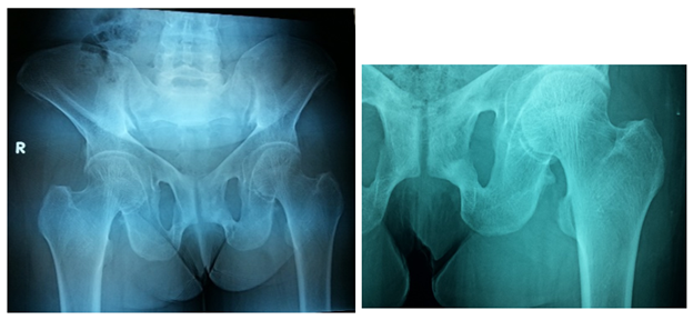 Figure 4 Frontal X-ray of the pelvis shows Triradiate pelvis, with coarsening of the trabeculation of the femoral head and neck. The femoral heads have lost their normal smooth rounded outline and are now showing relative flattening. There is bilateral protrusion acetabula and there is a linear translucency in the subtrochanteric region of the left femur suggesting pseudo fracture or Looser’s zone.