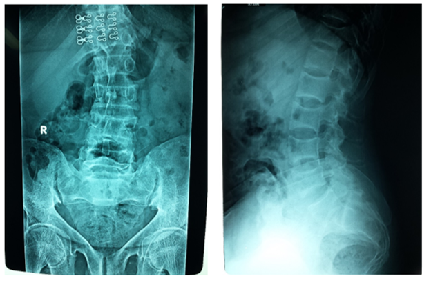 Figure 5 Right) Frontal X-ray of LSS shows marked scoliosis and there is subchondral resorption of the right sacro-iliac joint. (Left) Lateral X-ray of LSS shows biconcave appearance of the vertebral endplates (codfish vertebrae) with marked osteopenia. There is spondylolysis of L5 on S1 and there is pathological pedicles fractures of L5. There is overall noticeable diffused osteopenia.
