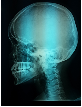 Figure 6 Lateral skull X-ray shows effacement (floating) of the teeth due to loss of alveolar lamina dura..