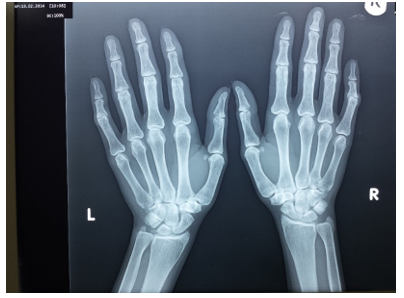 Figure 7 Frontal X-ray of both hands shows bilateral subperiosteal resorption of the radial sides of middle phalanges of middle fingers (pathognomonic of secondary hyperparathyroidism).