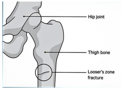 The Pelvis is markedly triradiate, with coarsening of the trabeculation of the femoral head and neck. The femoral heads have lost their normal smooth rounded outline, and are now showing relative flattening, there is a linear translucency in the sub-trochanteric region of the left femur and right inferior pubic ramus suggesting Looser’s zones Figure 4–7. The most impressive features of osteomalacia are the x-ray findings of what is considered to be diagnostic in osteomalacia. Pathologically, they are pseudo fractures except might rarely be present in Paget's disease. It appears as a thin, translucent band. Looser's zones are incomplete stress fractures that heal with callus which is poorly mineralized by calcium. They are frequently seen in the pubic bone, the necks of the femurs, and less frequently humerus and at the edge of the scapulae Figure 8.