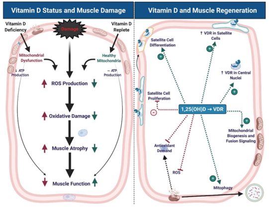 Recent reports have shown that Vitamin D is necessary for both bone and muscle health. The VDR is present abundantly in muscles. There is increasing evidence that Vitamin D plays an important role in counteracting muscle damage and is incorporated in regeneration. Muscle damage is characterized by a change in the architecture of muscle fibers, disruption of contractile protein, and mitochondrial dysfunction. During the insult, the VDR receptors will be enhanced in the sites of injury. As a result, this will lead to inhibition in the production of O2 radicles, which will enhance antioxidant activity and those activities that augment muscle damage which is characterized by disruption of muscle fibers, the contractile proteins, and mitochondrial dysfunction. On other hand, muscle regeneration is a very complicated process. Briefly, it involves restoration of mitochondrial function and activation of stem cells of the muscles (satellite cells). It has been shown that VDR knockdown animal models will result in decreased mitochondrial oxidative capacity and eventually energy production. It may suggest the essential role of vitamin D for mitochondrial health, and then the entire process of muscle regeneration. Therefore, it’s prudent to review the standardization of vitamin D insufficiency and the timely administration of Vitamin D analogs to maximize the role of Vitamin D. Deficiency of vitamin D results in muscle weakness and decreased speed and strength to sudden postural changes, and this will lead to falls, by 2 proposed mechanisms a) reduces inflammatory cytokines during muscle damage b) enhances myoblastic differentiation at the expense of stem cell-driven action to adipocytes Figure 9.