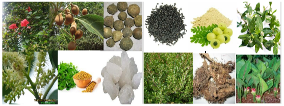 Unani drugs used for the treatment of premature graying of hair have the properties of Musawwid-e-shaar (Blackening of hairs), Muqawwi-e-shaar (Strengthening of hairs), Munbit-e-shar, Muhafiz-e-shaar, Qabiz, Habis, with Lateef Hararat, Mukhrij-e-balgham, Muqawwi e Aam, Mujaffif (Detergent) etc. Single drugs having these properties are Sumbul-ut-teeb (Nardostachys jatamansi), Zaranbad (Curcuma zedoaria), Amla Sabz (Emblica officinalis), Bhangra Sabz (Eclipta alba), Barg Hina Sabz(Lawsonia inermis), Roghan Kunjad (Sesamum indicum), Aas (Myrtus communis Linn), Shoneez, Zaitoon (Olea europaea), Harad (Terminalia chebula Linn), Baheda (Terminalia bellirica Linn), Aqaqia (Acacia arabica Linn), Mazu (Quercus infectoria), Methi (Trigonella foenum-graecum), Qarnphal (Myrtus Caryophyllus Spreng), Joz bova (Myristica fragrans), Gudhal (Hibiscus rosa-sinensis), Phitkari (Alam) etc (Figure 2).21,22