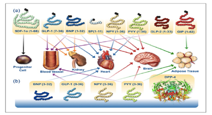 Therefore GLP-1 receptors and DPP4 inhibitors both stimulate insulin secretion and inhibit glucagon secretion in a glucose dependent manner. Among the substrates of DPP4 are peptide hormones such as β type natriuretic peptides,