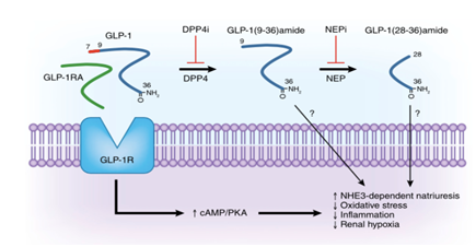 The inhibition of DPP4 or the use of GLP-1 receptor agonist results in the increased activation in the kidney, leading cAMP (cyclic AMP receptor) the activation of protein kinase (A) (Figure 6). This mechanism becomes maladaptive in diabetes, however as hyperglycemia rise the expression and activity of sodium-glucose cotransporter (SGLT2) in the proximal tubule of the kidney. As a result, glucose reabsorption may be increased by 20% in individuals with poorly controlled diabetes. SGLT2 is a low affinity, high capacity glucose transport protein that reabsorbs 90% of filteredglucose.6,45,68,92,106,107