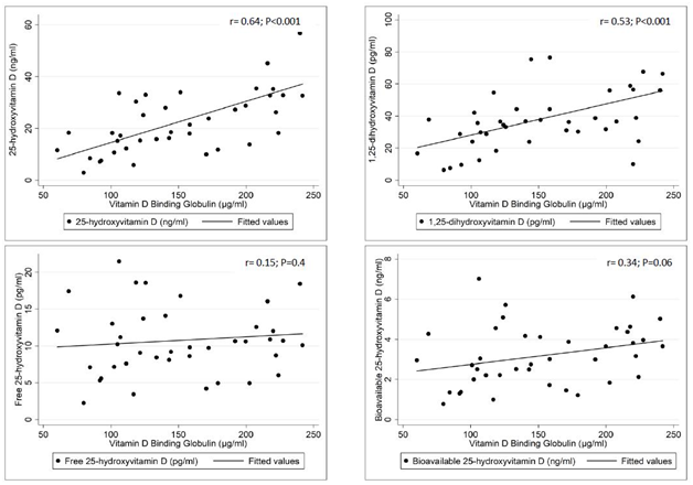 Methods: Correlation coefficients were calculated between log transformed VDBG and vitamin D measures. Linear regression models were constructed to examine the associations of total and free 25(OH)D levels with albumin corrected serum calcium and iPTH levels in 40 patients with cirrhosis.
