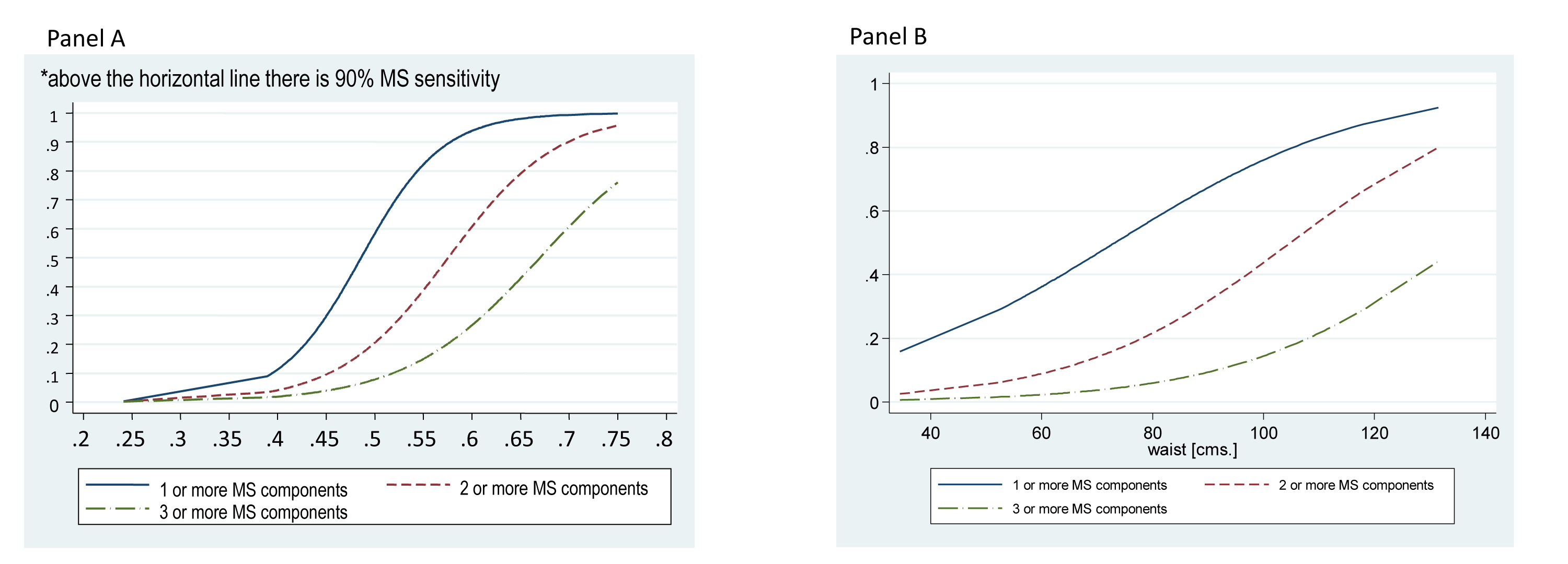 Using ROC curves, the optimal WSR cutoff point to predict MS turned out to be 0.55 for both sexes, with 72% sensitivity and 70% specificity. The positive and negative predictive values were 30 and 94% respectively. The LR (post-test probability ratio) was 2.5. The area below the ROC curve was 0.766.