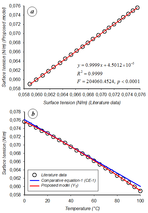 In this study, predictive performances of the derived nonlinear regression-based models were also compared with other formulations in a numerical manner. For the estimation of the surface tension (σs in N/m) data, determination coefficients (R2) were determined as 0.9982 and 0.9999, respectively, for the first comparative equation (CE-1, Equation (7)) 7,16 and the proposed surface tension model (Equation (2)). The numerical results revealed that the derived formulation given in Equation (2) demonstrated better estimations than the comparative equation-1 (CE-1). Moreover, for the forecast of the specific weight (γw in kgf/m3) data, the R2 values were computed as 1.0000, 0.9844, and 1.0000, respectively, for the second comparative equation (CE-2, Thiesen-Scheel-Diesselhorst equation, Equation (8)), 7,17 the third comparative equation (CE-3, Gill’s equation, Equation (9)), 7,17 and the proposed specific weight model (Equation (4)). In the prediction of the specific weight, the proposed equation (Equation (4)) was determined as successful as the Thiesen-Scheel-Diesselhorst equation (Equation (8)) and showed a better estimation performance than the Gill’s equation (Equation (9)). Furthermore, for the forecast of the kinematic viscosity (νw in m2/s) data, the R2 values were calculated as 0.9996, 0.9986, and 0.9999, respectively, for the forth comparative equation (CE-4, Poiseuille’s equation, Equation (10)), 4,7,18 for the fifth comparative equation (CE-5, Equation (11)),4,7,18 and the proposed kinematic viscosity (Equation (6)). The numerical outputs indicated that the derived formulation given in Equation (6) exhibited better prediction performance compared to the comparative equation-4 (CE-4) and the comparative equation-5 (CE-5). Finally, from the numerical point of view, it is also noted that some useful recent investigations can be found in the field of thermal energy storage,19 nanofluid flow,20,21 low-fluid pressure safety valve design,22 heat transfer,23 and thermal analysis.24