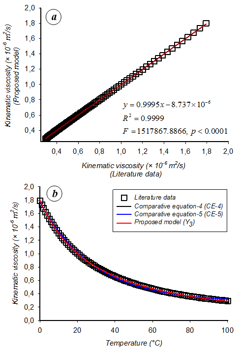 Predictive performances of the proposed nonlinear regression-based models [Y1: σs=f(T), Y2: γw=f(T), Y3: νw=f(T)] are summarized in Table 4. Based the statistical outputs that were determined for each model, it could be inferred that the derived equations exhibited a very satisfactory performance on the estimation of surface tension, specific weight, and kinematic viscosity of water as a function of temperature (R2=0.9999 for all formulations). This result revealed that only 0.01% of the total variations were not described by the proposed equations. Moreover, the large magnitude of the adjusted determination coefficient (Radj2=0.9999) corroborated the significance of the proposed models.12 It is noted that if there are many terms in the model and the sample size is not very large, the Radj2 may be noticeably smaller than the R2.12 For the proposed equations, the Radj2 was determined to be very close to the R2 value (almost same), indicating that the compatibility of the sample size used in the present modelling study. Furthermore, very low values of the coefficient of variation (CV=0.0912%, 0.0039%, and 0.4583%, respectively, for surface tension, specific weight, and kinematic viscosity models) demonstrated a high degree of exactitude for the developed formulations, as emphasized in the previous studies.12–15 As seen from Table 4, other statistical indices also revealed that the present equations yielded very small errors (in terms of MAE, RMSE, RMSES, RMSEU, and PSE) or deviations (according to the closeness to 1 and 0, respectively, for IA and FV) and demonstrated a superior performance on the prediction of the studied fluid mechanics-related parameters (e.g. surface tension, specific weight, and kinematic viscosity of water) as a function of temperature.O, P, m, reg, and i are the subscripts indicating the observed (theoretical), predicted, mean, regression, and index of data points, respectively, σ is the standard deviation, n is the number of data points, p is the total number of explanatory variables in the model (without including the constant term). Finally, Figures 1–3 depict the correlations with best linear equations and corresponding visual agreements between the proposed models and comparative equations. The comparative equations (CE-1 (Equation (7)): σs in N/m, CE-2 (Equation (8) and CE-3 (Equation (9): γw in kgf/m3, CE-4 (Equation (10) and CE-5 (Equation (11): νw in m2/s) obtained from the literature4–7, 16–18 are given in Equations (7)–(11). As seen these figures, the proposed surface tension, specific weight, and kinematic viscosity models demonstrated very satisfactory performance (R2=0.9999≈1.0000, p-values <α=0.05) and were comparable with other models.