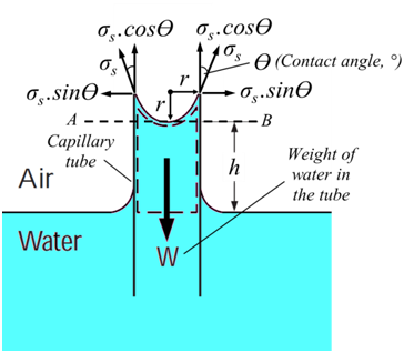 A 0.5-mm-diameter glass capillary tube of uniform bore is dipped vertically in a beaker containing water at 20 °C. Due to surface tension, water rises to a height h in the capillary tube as shown in Figure 4. In atmospheric air, the contact angle of water (and most other organic liquids) with glass is nearly zero, θ≈0°. Determine the capillary rise of water in the tube using the proposed surface tension and specific gravity equations given in Equation (2) and (4), respectively. The horizontal component σs∙sinθ acts radially outwards, but vertical component σs∙cosθ acts upwards. It is noted that the horizontal component acting all along the circumference of the tube eliminate each other whereas the vertical component balances the weight of water column in the capillary tube. This upward force is responsible for the capillary rise. As the water column is in equilibrium, this force acting upwards is equal to weight of the water column acting downwards. Volume of water in the tube is consisted of a cylindrical water column of height h and water in the meniscus above the plane AB (Figure 4). Thus, volume of cylindrical water column = π∙r2∙h, and volume of water in the meniscus = (volume of cylinder of height r and radius r) – (volume of hemisphere). It is assumed that there are no impurities in the water and no contamination on the surfaces of the glass tube. Also, the experiment is conducted in atmospheric air.