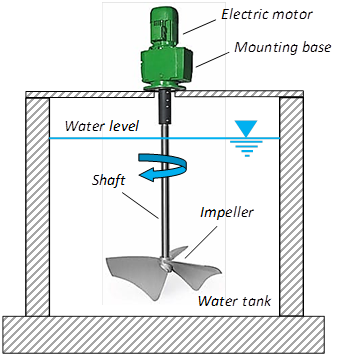 The safe power required for an electric motor rotating a vertical agitator (Figure 5) will be determined based on the following variables: (i) tank volume of 250 m3, (ii) velocity gradient of 5001/s, (iii) temperature of 15 °C, and (iv) safety factor of 1.2 (1 kW=1000 × Watt (W)=1000 × N∙m/s).