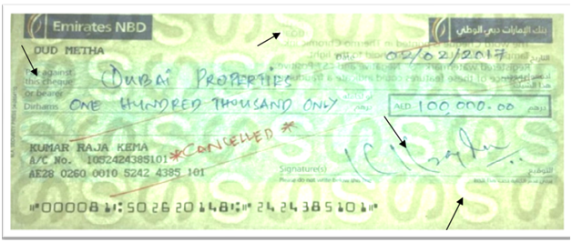 Citation: Sharma B, Sharma A, Rohatgi S, et al. A comparative study on security features of Indian, Canadian and Dubai cheques. Forensic Res Criminol Int J. 2018;6(3):254-259. DOI: 10.15406/frcij.2018.06.00212
