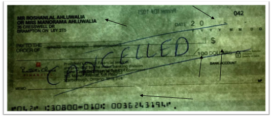 Microscopic features: Modern Indian cheque has microscopic features which are located on entire paper or underneath the date columns, pay column, amount box, and rupee column.5 These features can be examined under the microscopes or can be recognized using a magnifying glass. So, if the cheque is photocopied or scanned these micro letters would not be legible. In Canadian cheque micro printing is present on the back side which is depicted as “ORIGINAL DOCUMENT” and cannot be displayed on photocopied cheque.