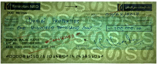 Cheque is a document that orders the bank to pay a specific amount of money from the holder’s account to the person whose details are drafted on the cheque. Cheque is one of the most prevailing documents of the bank whose chances of being counterfeited is maximum, therefore in order to prevent counterfeiting the cheque are being embedded with security features. Cheque is essentially considered as the bill of exchange that is manufactured in order to make money transactions without having cash in hand.1 Section 13 of Negotiable Instruments Act, 1881 (Act no. 26 of 1881) of Indian constitution states that a negotiable instrument is a promissory note, bill of exchange or a cheque payable either to payee or to a bearer and Section 6 of this Act exclusively defines a cheque as a bill of exchange drawn on a specified banker, and not expressed to be payable otherwise than on demand.2 Cheque is an instrument in writing containing an unconditional order, addressed to a banker, signed by the person who has deposited money with the banker, requiring him to pay on demand a certain sum of money only two or to the order of a certain person or to the bearer of instrument.3