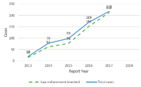 To address the limitations in the data collected in the comprehensive case review, the authors recommend additional variables be collected as part of the DCBS intake, screening, and assessment process. Based on the existing literature regarding risk factors for child trafficking and the need to address overlooked populations, the Statewide Human Trafficking Task Force (SHTTF) work group members recommended considering additional information to be collected by reporting parties at intake, including the following: What was the race/ethnic identity of the alleged victim?, What was the sexual identity of the alleged victim?, What was sex exchanged for?, Was there a history of sexual abuse?, Was there a history of running away or homelessness?, Was there gang-involvement in relation to the alleged trafficking incident(s)?, Were there multiple victims of the alleged perpetrator?, Was technology involved? If so how? These additional variables can help inform future practice among child welfare workers, professionals, and systems, by addressing risk factors supported by research to be associated with child trafficking as well as to better understand the experiences of child trafficking victims. As shown in the DCBS data analysis, a trend emerged over the 5-year period from 2013 and 2017: law enforcement personnel were more involved in child trafficking investigations and professionals were more likely to report alleged cases of child trafficking. It is likely that this trend is due to the increase in statewide human trafficking trainings and case consultation and support provided by the Kentucky Office of the Attorney General (OAG) during that same time period. In 2016, the OAG was awarded a three-year grant from the Bureau of Justice Assistance and the Office for Victims of Crime to address human trafficking in the state of Kentucky(Kentucky Office of the Attorney General and Catholic Charities of Louisville Enhanced Collaborative Model Grantee Committee, 2017). Specifically, the grant funded a new full-time human trafficking investigator position housed within the OAG. This human trafficking investigator provided training and case consultation to local law enforcement jurisdictions across the state of Kentucky.